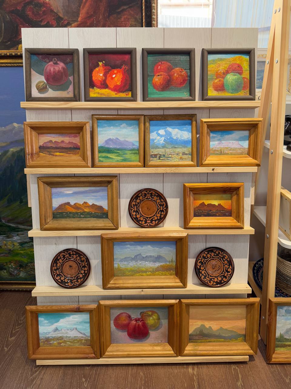 Дүкөндө живопись, керамика, жыгач буюмдары, уникалдуу декорлор, сувенирлер жана башка кооз жасалгалар чогулган.
